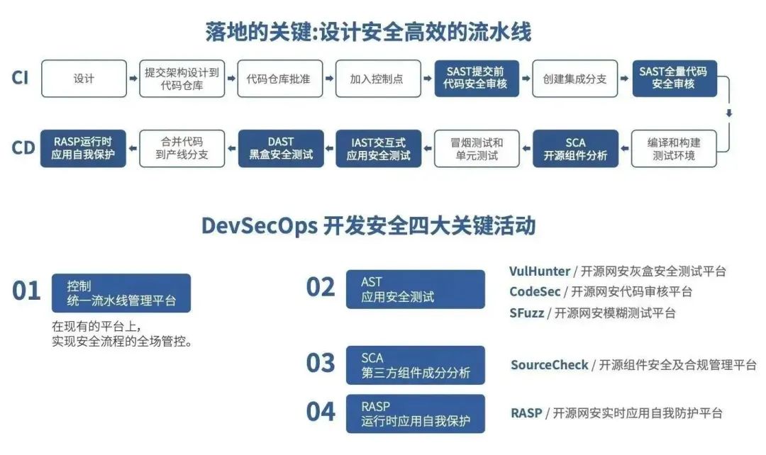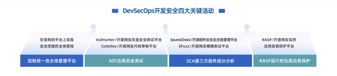 在设计阶段通过威胁建模,自动生成与业务需求相关的安全任务,从软件开发早期介入安全活动。在编码、测试阶段,通过强大的CI/CD流水线无缝、透明地将安全检测工具(SCA、SAST、IAST等)融入整个研发周期;同时,在上线运行阶段,提供运行时安全防护(RASP),实现真正的安全检测常态化。